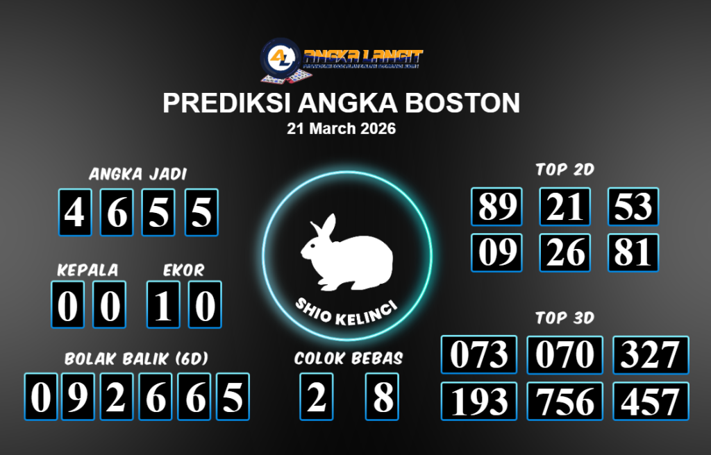 Prediksi ANGKA LANGIT memberikan banyak data akurat untuk togel online, termasuk prediksi Boston hari ini. Sebelum anda memasang angka 2D jitu untuk Boston hari ini, sebaiknya luangkan waktu untuk mengunjungi forum prediksi Boston. Kami akan membagikan informasi tentang Boston hari ini yang sangat layak untuk dicoba. Bagi Anda yang telah membaca prediksi akurat dari Angka Langit untuk Boston hari ini dan merasa sesuai, segera pasang angka tersebut di situs togel online Angkatoto138 dan sudah menjadi tempat bermain Anda selama ini.