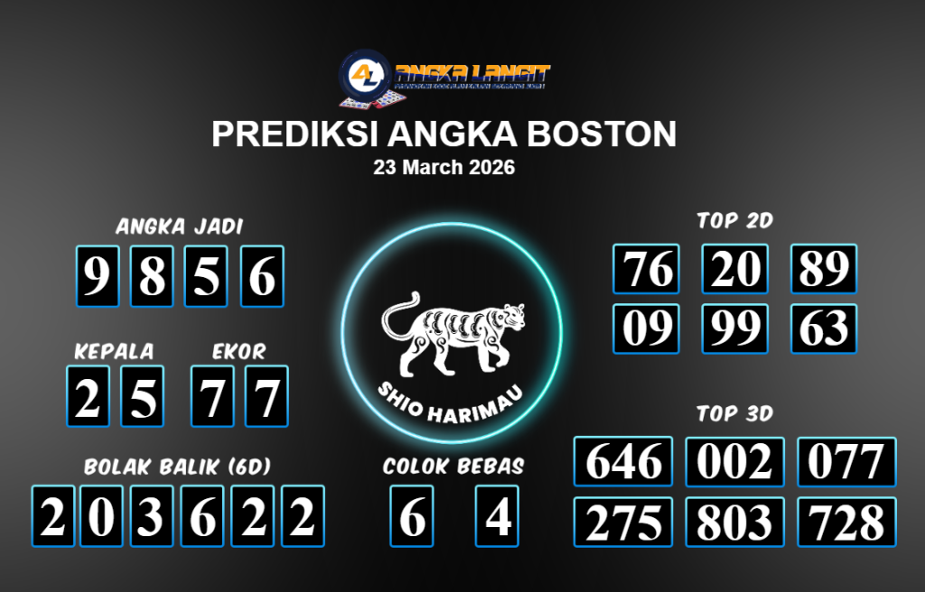 Prediksi ANGKA LANGIT memberikan banyak data akurat untuk togel online, termasuk prediksi Boston hari ini. Sebelum anda memasang angka 2D jitu untuk Boston hari ini, sebaiknya luangkan waktu untuk mengunjungi forum prediksi Boston. Kami akan membagikan informasi tentang Boston hari ini yang sangat layak untuk dicoba. Bagi Anda yang telah membaca prediksi akurat dari Angka Langit untuk Boston hari ini dan merasa sesuai, segera pasang angka tersebut di situs togel online Angkatoto138 dan sudah menjadi tempat bermain Anda selama ini.