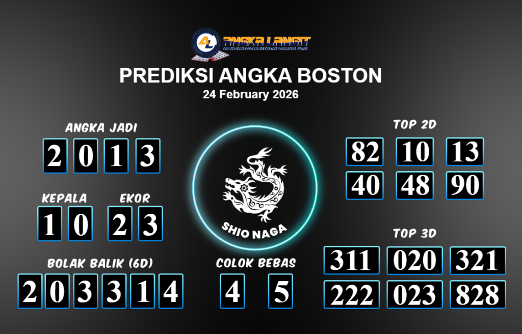 Prediksi ANGKA LANGIT memberikan banyak data akurat untuk togel online, termasuk prediksi Boston hari ini. Sebelum anda memasang angka 2D jitu untuk Boston hari ini, sebaiknya luangkan waktu untuk mengunjungi forum prediksi Boston. Kami akan membagikan informasi tentang Boston hari ini yang sangat layak untuk dicoba. Bagi Anda yang telah membaca prediksi akurat dari Angka Langit untuk Boston hari ini dan merasa sesuai, segera pasang angka tersebut di situs togel online Angkatoto138 dan sudah menjadi tempat bermain Anda selama ini.