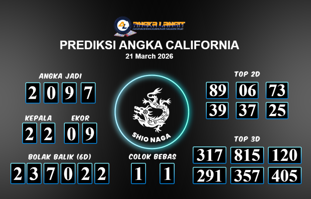 Prediksi ANGKA LANGIT memberikan banyak data akurat untuk togel online, termasuk prediksi California hari ini. Sebelum anda memasang angka 2D jitu untuk California hari ini, sebaiknya luangkan waktu untuk mengunjungi forum prediksi California. Kami akan membagikan informasi tentang California hari ini yang sangat layak untuk dicoba. Bagi Anda yang telah membaca prediksi akurat dari Angka Langit untuk California hari ini dan merasa sesuai, segera pasang angka tersebut di situs togel online Angkatoto138 dan sudah menjadi tempat bermain Anda selama ini.