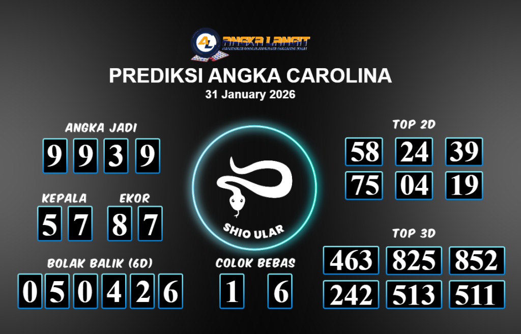 Prediksi ANGKA LANGIT memberikan banyak data akurat untuk togel online, termasuk prediksi Carolina hari ini. Sebelum anda memasang angka 2D jitu untuk Carolina hari ini, sebaiknya luangkan waktu untuk mengunjungi forum prediksi Angka Langit. Kami akan membagikan informasi tentang Carolina hari ini yang sangat layak untuk dicoba. Bagi Anda yang telah membaca prediksi akurat dari Angka Langit untuk Carolina hari ini dan merasa sesuai, segera pasang angka tersebut di situs togel online Angkatoto138 dan sudah menjadi tempat bermain Anda selama ini.