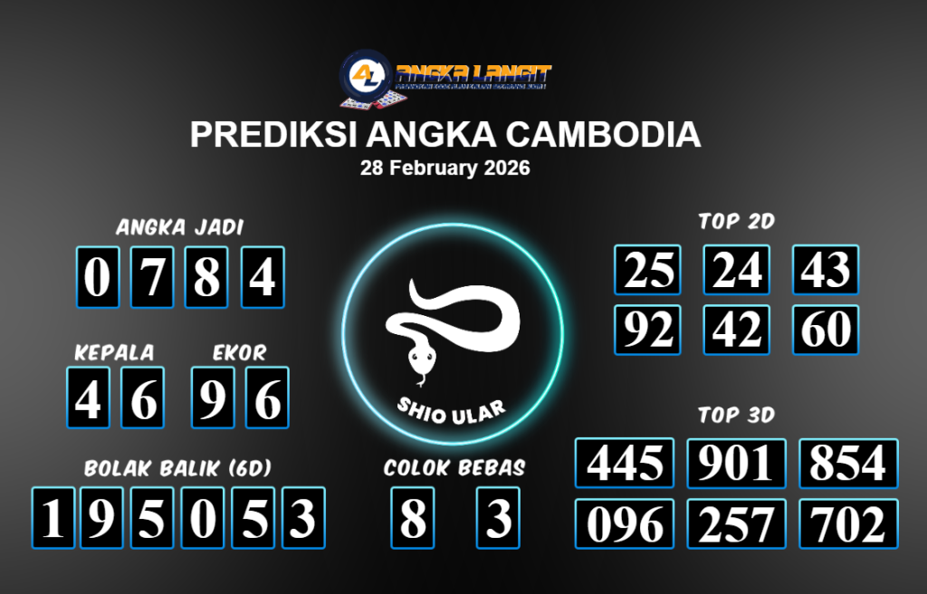 Prediksi ANGKA LANGIT memberikan banyak data akurat untuk togel online, termasuk prediksi Cambodia hari ini. Sebelum anda memasang angka 2D jitu untuk Cambodia hari ini, sebaiknya luangkan waktu untuk mengunjungi forum prediksi Cambodia. Kami akan membagikan informasi tentang Cambodia hari ini yang sangat layak untuk dicoba. Bagi Anda yang telah membaca prediksi akurat dari Angka Langit untuk Cambodia hari ini dan merasa sesuai, segera pasang angka tersebut di situs togel online Angkatoto138 dan sudah menjadi tempat bermain Anda selama ini.