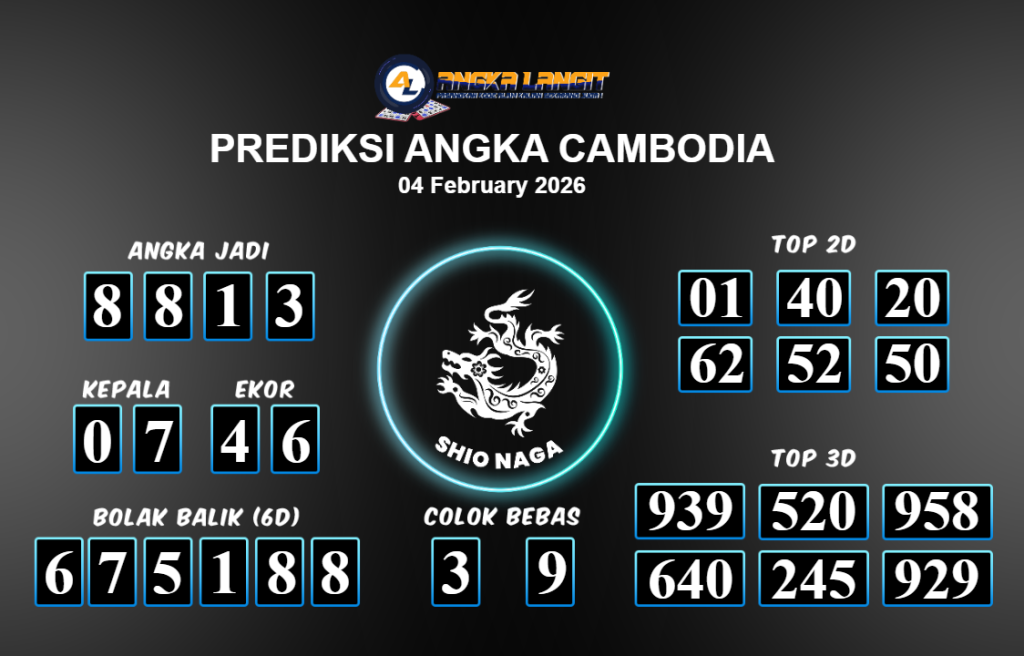 Prediksi ANGKA LANGIT memberikan banyak data akurat untuk togel online, termasuk prediksi Cambodia hari ini. Sebelum anda memasang angka 2D jitu untuk Carolina Day hari ini, sebaiknya luangkan waktu untuk mengunjungi forum prediksi Angka Langit. Kami akan membagikan informasi tentang Cambodia hari ini yang sangat layak untuk dicoba. Bagi Anda yang telah membaca prediksi akurat dari Angka Langit untuk Cambodia hari ini dan merasa sesuai, segera pasang angka tersebut di situs togel online Angkatoto138 dan sudah menjadi tempat bermain Anda selama ini.