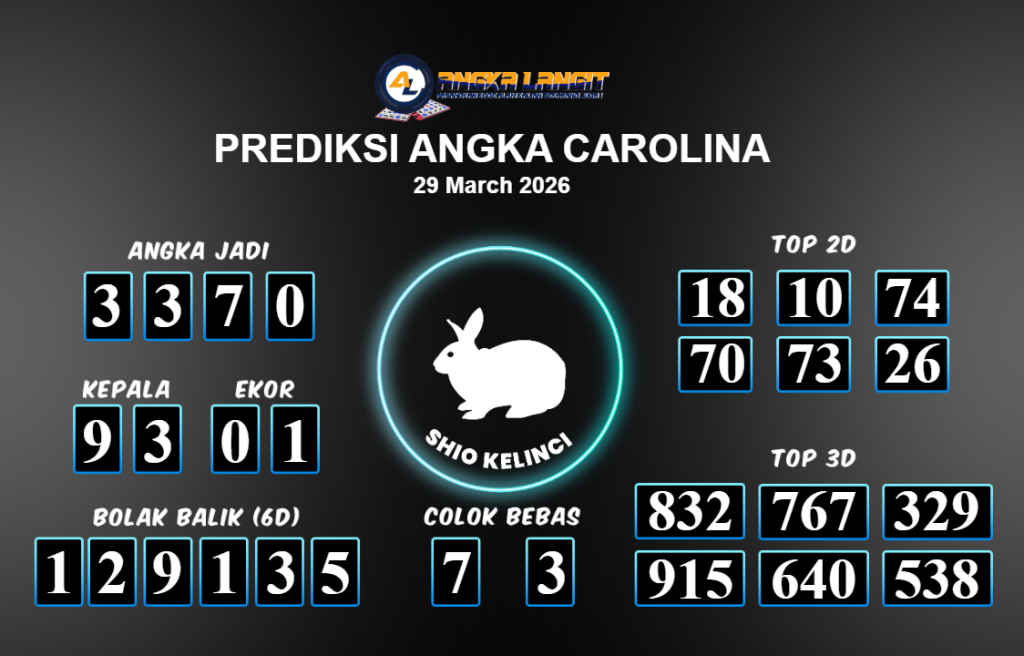 Prediksi ANGKA LANGIT memberikan banyak data akurat untuk togel online, termasuk prediksi Carolina hari ini. Sebelum anda memasang angka 2D jitu untuk Carolina hari ini, sebaiknya luangkan waktu untuk mengunjungi forum prediksi Carolina. Kami akan membagikan informasi tentang Carolina hari ini yang sangat layak untuk dicoba. Bagi Anda yang telah membaca prediksi akurat dari Angka Langit untuk Carolina hari ini dan merasa sesuai, segera pasang angka tersebut di situs togel online Angkatoto138 dan sudah menjadi tempat bermain Anda selama ini.