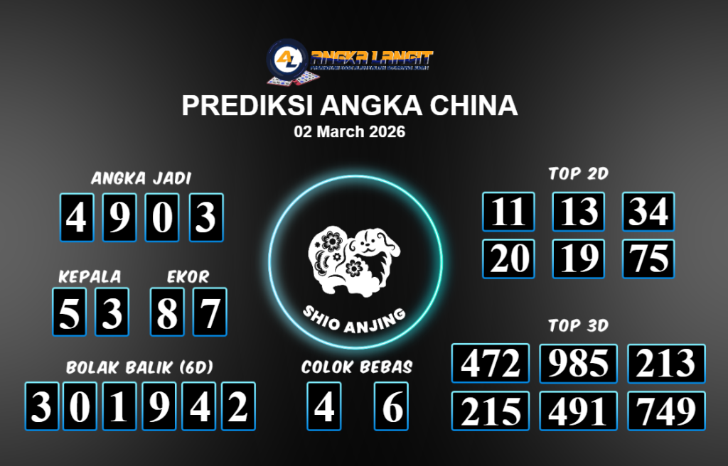 Prediksi ANGKA LANGIT memberikan banyak data akurat untuk togel online, termasuk prediksi China hari ini. Sebelum anda memasang angka 2D jitu untuk China hari ini, sebaiknya luangkan waktu untuk mengunjungi forum prediksi China. Kami akan membagikan informasi tentang China hari ini yang sangat layak untuk dicoba. Bagi Anda yang telah membaca prediksi akurat dari Angka Langit untuk Atlanta hari ini dan merasa sesuai, segera pasang angka tersebut di situs togel online Angkatoto138 dan sudah menjadi tempat bermain Anda selama ini.