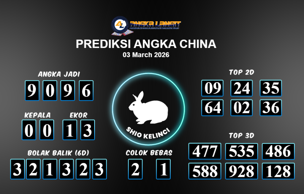 Prediksi ANGKA LANGIT memberikan banyak data akurat untuk togel online, termasuk prediksi China hari ini. Sebelum anda memasang angka 2D jitu untuk China hari ini, sebaiknya luangkan waktu untuk mengunjungi forum prediksi China. Kami akan membagikan informasi tentang China hari ini yang sangat layak untuk dicoba. Bagi Anda yang telah membaca prediksi akurat dari Angka Langit untuk China hari ini dan merasa sesuai, segera pasang angka tersebut di situs togel online Angkatoto138 dan sudah menjadi tempat bermain Anda selama ini.
