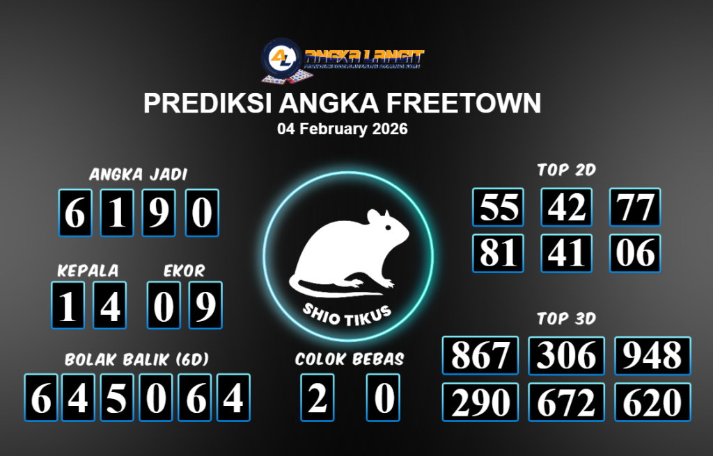 Prediksi ANGKA LANGIT memberikan banyak data akurat untuk togel online, termasuk prediksi Freetown Day hari ini. Sebelum anda memasang angka 2D jitu untuk Freetown hari ini, sebaiknya luangkan waktu untuk mengunjungi forum prediksi Angka Langit. Kami akan membagikan informasi tentang Freetown hari ini yang sangat layak untuk dicoba. Bagi Anda yang telah membaca prediksi akurat dari Angka Langit untuk Freetown hari ini dan merasa sesuai, segera pasang angka tersebut di situs togel online Angkatoto138 dan sudah menjadi tempat bermain Anda selama ini.
