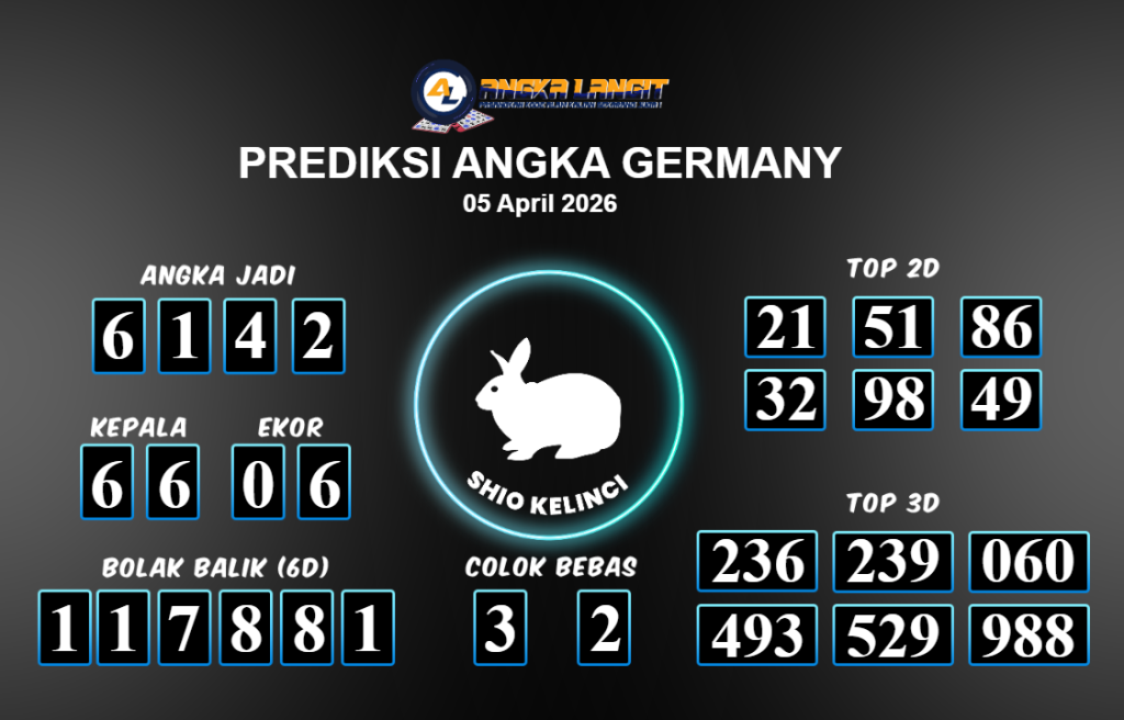 Prediksi ANGKA LANGIT memberikan banyak data akurat untuk togel online, termasuk prediksi Germany hari ini. Sebelum anda memasang angka 2D jitu untuk Germany hari ini, sebaiknya luangkan waktu untuk mengunjungi forum prediksi Germany. Kami akan membagikan informasi tentang Germany hari ini yang sangat layak untuk dicoba. Bagi Anda yang telah membaca prediksi akurat dari Angka Langit untuk Germany hari ini dan merasa sesuai, segera pasang angka tersebut di situs togel online Angkatoto138 dan sudah menjadi tempat bermain Anda selama ini.