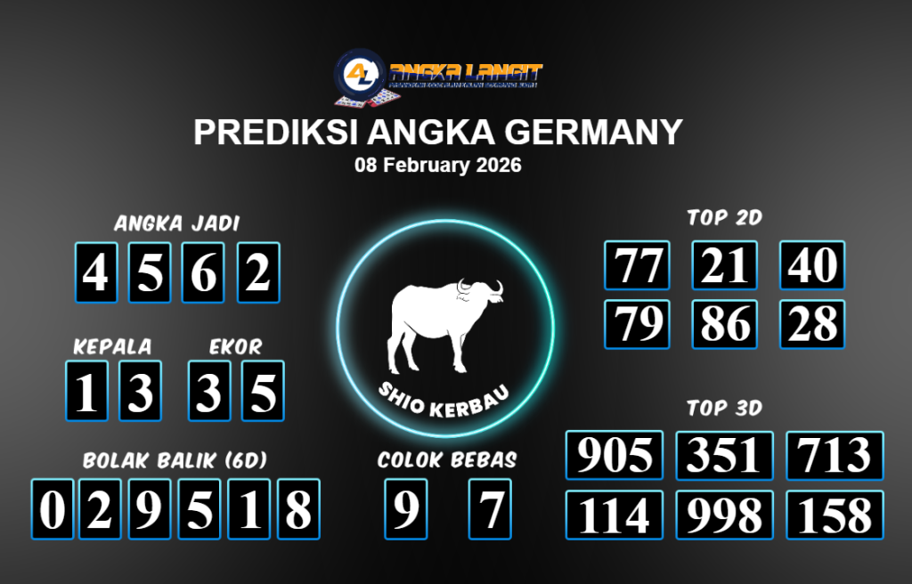 Prediksi ANGKA LANGIT memberikan banyak data akurat untuk togel online, termasuk prediksi Germany hari ini. Sebelum anda memasang angka 2D jitu untuk Germany hari ini, sebaiknya luangkan waktu untuk mengunjungi forum prediksi Angka Langit. Kami akan membagikan informasi tentang Germany hari ini yang sangat layak untuk dicoba. Bagi Anda yang telah membaca prediksi akurat dari Angka Langit untuk Germany hari ini dan merasa sesuai, segera pasang angka tersebut di situs togel online Angkatoto138 dan sudah menjadi tempat bermain Anda selama ini.