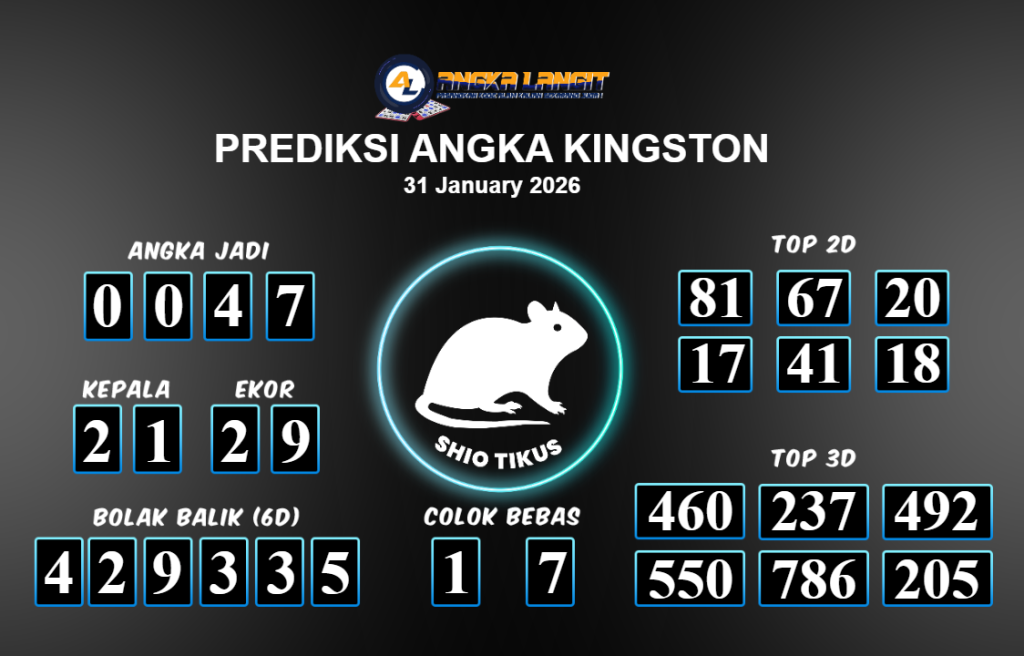 Prediksi ANGKA LANGIT memberikan banyak data akurat untuk togel online, termasuk prediksi Kingston hari ini. Sebelum anda memasang angka 2D jitu untuk Kingston hari ini, sebaiknya luangkan waktu untuk mengunjungi forum prediksi Angka Langit. Kami akan membagikan informasi tentang Kingston hari ini yang sangat layak untuk dicoba. Bagi Anda yang telah membaca prediksi akurat dari Angka Langit untuk Kingston hari ini dan merasa sesuai, segera pasang angka tersebut di situs togel online Angkatoto138 dan sudah menjadi tempat bermain Anda selama ini.