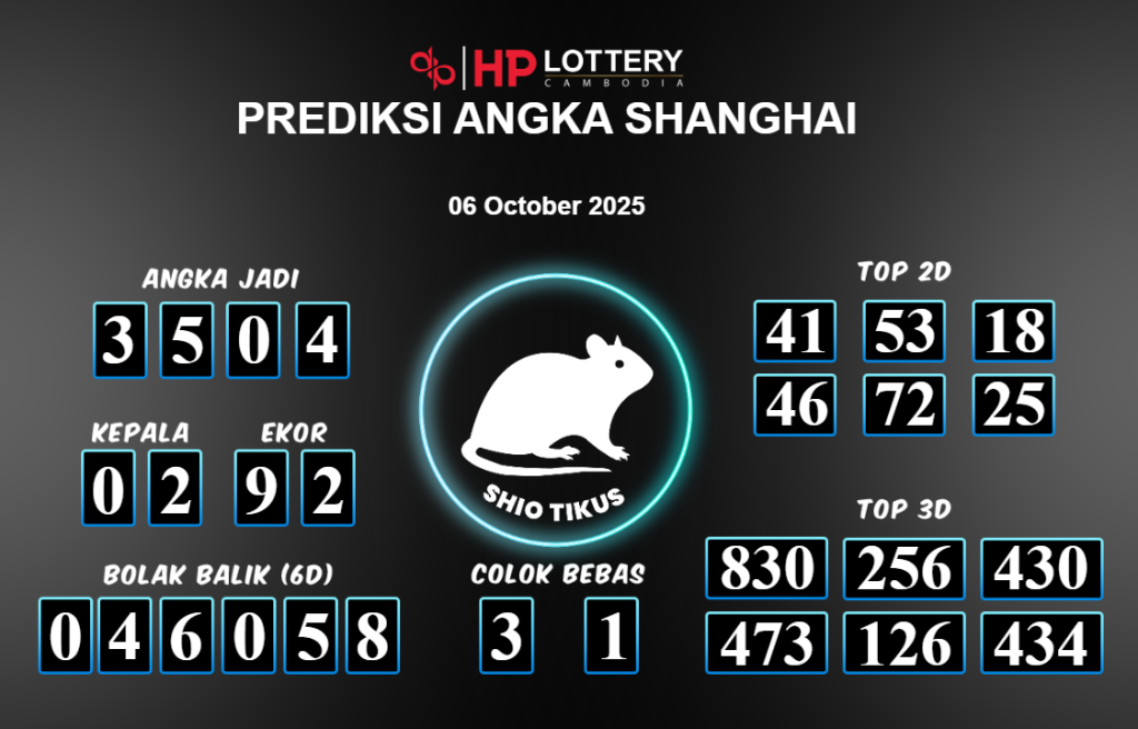 Prediksi ANGKA LANGIT memberikan banyak data akurat untuk togel online, termasuk prediksi Shanghai hari ini. Sebelum anda memasang angka 2D jitu untuk Shanghai hari ini, sebaiknya luangkan waktu untuk mengunjungi forum prediksi Angka Langit. Kami akan membagikan informasi tentang Shanghai hari ini yang sangat layak untuk dicoba. Bagi Anda yang telah membaca prediksi akurat dari Angka Langit untuk Shanghai hari ini dan merasa sesuai, segera pasang angka tersebut di situs togel online bibit288 dan sudah menjadi tempat bermain Anda selama ini.