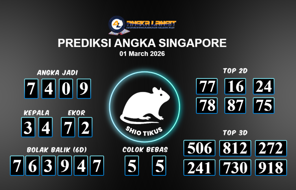 Prediksi ANGKA LANGIT memberikan banyak data akurat untuk togel online, termasuk prediksi Singapore hari ini. Sebelum anda memasang angka 2D jitu untuk Singapore hari ini, sebaiknya luangkan waktu untuk mengunjungi forum prediksi Singapore. Kami akan membagikan informasi tentang Singapore hari ini yang sangat layak untuk dicoba. Bagi Anda yang telah membaca prediksi akurat dari Angka Langit untuk Singapore hari ini dan merasa sesuai, segera pasang angka tersebut di situs togel online Angkatoto138 dan sudah menjadi tempat bermain Anda selama ini.