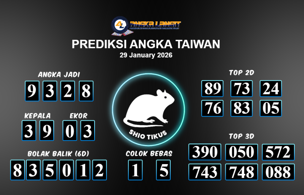 Prediksi ANGKA LANGIT memberikan banyak data akurat untuk togel online, termasuk prediksi Taiwan hari ini. Sebelum anda memasang angka 2D jitu untuk Taiwan hari ini, sebaiknya luangkan waktu untuk mengunjungi forum prediksi Angka Langit. Kami akan membagikan informasi tentang Taiwan hari ini yang sangat layak untuk dicoba. Bagi Anda yang telah membaca prediksi akurat dari Angka Langit untuk Taiwan hari ini dan merasa sesuai, segera pasang angka tersebut di situs togel online Angkatoto138 dan sudah menjadi tempat bermain Anda selama ini.